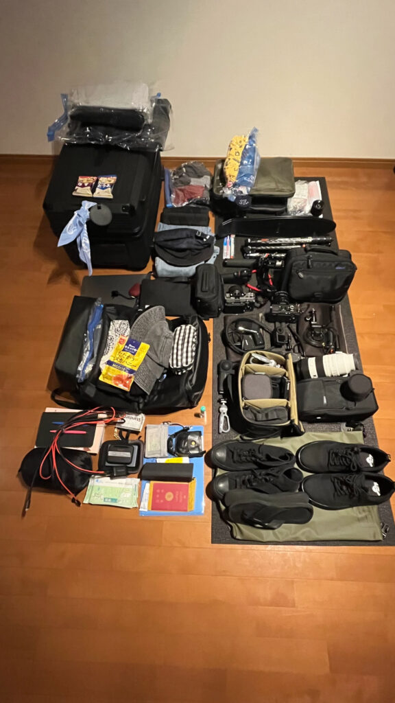 Insta 360 X4,X5,Sony a7CII,Sony FX3、Sigma14mm, Sony 70-200F2.8、Sony28-60、SDカード各種、MacBookAir, 外付けSSD各種、eSIM、三脚、一脚、ミニ三脚、クランプ、吸盤マウント、バッテリー各種、DJI Ronin、DJI Mic Mini、iPad、